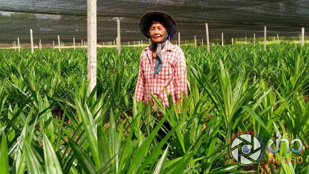 ป้าธนพร แสงเนตร หรือใครๆเรียกจนติดปาก “ป้าเหลย”อายุ 74 ปี อยู่บ้านเลขที่ 55/1 ม.3 บ.เพชรเอิม ต.วังดาล อ.กบินทร์บุรี จ.ปราจีนบุรี ได้หันมาปลูกใบเตยเพื่อตัดใบขายบนเนื้อที่ 4 ไร่ ซึ่งได้แบ่งพื้นที่นามาปลูกใบเตยเพื่อตัดใบขาย