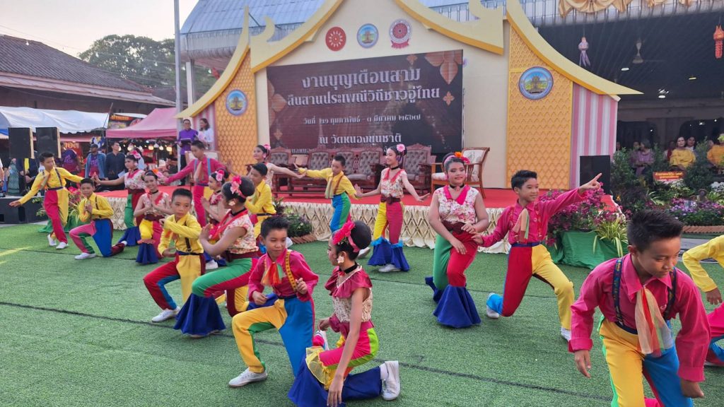 ส่วนบรรยากาศภายในงานได้มีการแสดงพื้นบ้านสืบสานประเพณีชาวมอญ เพื่อให้เด็กรุ่นหลังได้ชมถึงประวัติคนสมัยก่อน พร้อมกับมีการแสดงนักเรียนโรงเรียนอนุบาลวัดหนองขุนชาติ และการแสดงของนักเรียนทองประสานเวทย์ โดยงานประเพณีบุญเดือนสาม สืบสานประเพณีวิถีชาวอู่ไท ประจำปี 2567 มีกิจกรรมประกอบด้วยพิธีอุปสมบท เฉลิมพระเกียรติพระบาทสมเด็จพระเจ้าอยู่หัว เนื่องในโอกาสมหามงคลเฉลิมพระชนมพรรษา 6 รอบ 28 กรกฎาคม 2567 พิธีทำขวัญข้าวแม่โพสพ การประกวดขบวนแห่วัฒนธรรมประเพณี การจัดสำรับคาว – หวาน ประเพณีดั้งเดิมของชาวอู่ไท การประกวดขบวนหาบสำรับคาว – หวาน การแสดงความสามารถของเยาวชนในการร้องเพลงไทยลูกทุ่ง การละเล่นพื้นบ้าน การอนุรักษ์สืบสานวิถีชีวิตและวัฒนธรรมท้องถิ่นสู่รุ่นหลังให้คงอยู่สืบไป โดยในวันที่ 2 มีนาคม 2567 เวลา 07.30น.ชม ชมขบวนการประกวด แห่วัฒนธรรมประเพณี(แห่นาค) รำวงหน้านาค และสำหรับคามหวาน และวิถีธรรม ของ เทศบาล และ องค์การบริหารส่วนตำบลต่างทั้ง 8 อำเภอ ที่สวยงาม