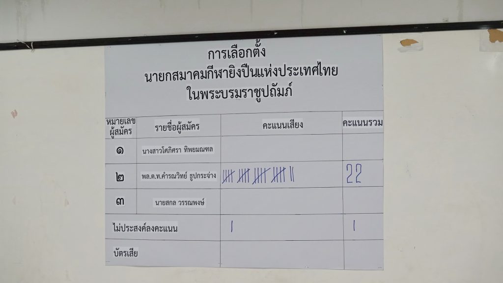ต่อมาในที่ประชุมที่เหลือได้ดำเนินการประชุมต่อ โดยมี น.ส.กมลวรรณ สุทธิบุตร ผู้แทนของการกีฬาแห่งประเทศไทย (กกท.) ร่วมสังเกตการณ์อย่างต่อเนื่อง และได้มีการโหวตเลือก ผศ.ทศพร เหรียญเจริญ อุปนายกฯ ขึ้นเป็นประธานในที่ประชุมแทน โดยมีสโมสรลงคะแนนเสียงรับรอง 23 เสียง เกินกึ่งหนึ่ง 42 เสียง ได้มีการลงคะแนนเสียงให้ใช้การโหวตแบบเปิดเผยขานชื่อในที่ประชุม ผลปรากฎว่า พล.ต.ท.คำรณวิทย์ ธูปกระจ่าง (บิ๊กแจ๊ส) ได้รับเสียงโหวต 22 คะแนน และไม่ประสงค์ลงคะแนน 1 เสียง ชนะคู่แข่งขาดลอย.