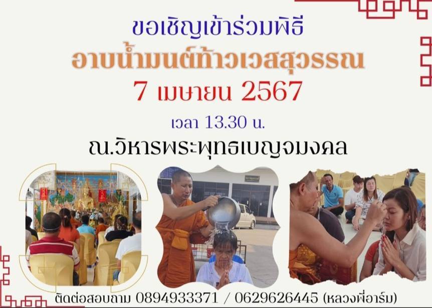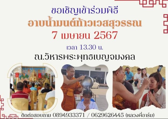 วัดมงคลรัตน์ (คลอง12) ต.ลำไทร อ.ลำลูกกา จ.ปทุมธานี ได้จัดพิธีอาบน้ำมนต์ท้าวเวสสุวรรณ เพื่อสะเดาะเคราะห์ ปัดเป่าสิ่งชั่วร้าย ช่วยเสริมสิริมงคลให้แก่ชีวิตและครองครัว ซึ่งงานจะจัดขึ้นในวันอาทิตย์ที่ 7 เมษายน 2567 พิธีอาบน้ำมนต์ท้าวเวสสุวรรณ จะเริ่มตั้งแต่เวลา 13.30 น.ที่บริเวณหน้าวิหารหลวงพ่อแก้วนิมิตรมงคล