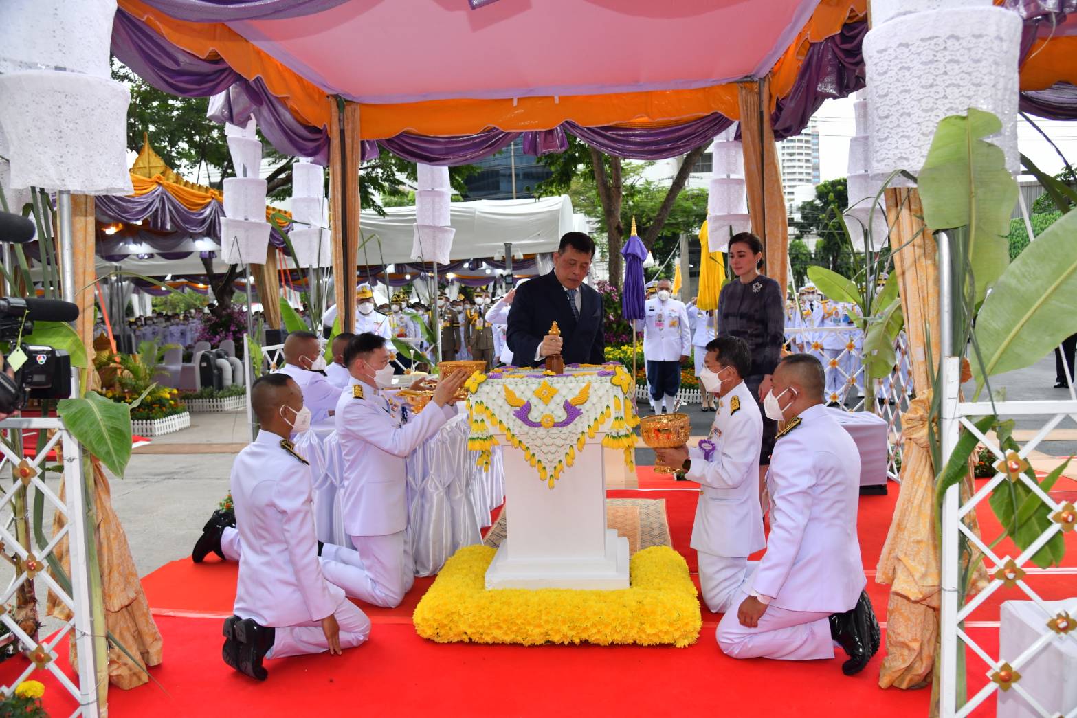 จากนั้น นางอโนชา ชีวิตโสภณ ประธานศาลฎีกา กราบบังคมทูลรายงาน พร้อมขอพระราชทานกราบบังคมทูลเชิญเสด็จ ฯ ทรงประกอบพิธีวางศิลาฤกษ์ และทรงเปิดอาคารที่ทำการสำนักงานศาลยุติธรรมพระบาทสมเด็จพระเจ้าอยู่หัว เสด็จออกจากพลับพลาพิธี ไปยังมณฑลพิธีวางศิลาฤกษ์ ทรงพระสุหร่าย ทรงเจิมแผ่นอิฐ ทอง นาก เงิน แผ่นศิลาฤกษ์แล้วทรงวางลงในหลุม เสด็จ ฯ ไปยัง แท่นพิธีทรงกดปุ่มไฟฟ้าเปิดแพรคลุมป้ายอาคารที่ทำการสำนักงานศาลยุติธรรม