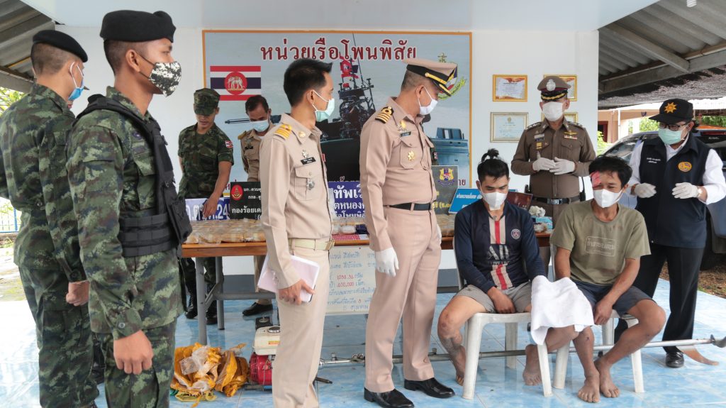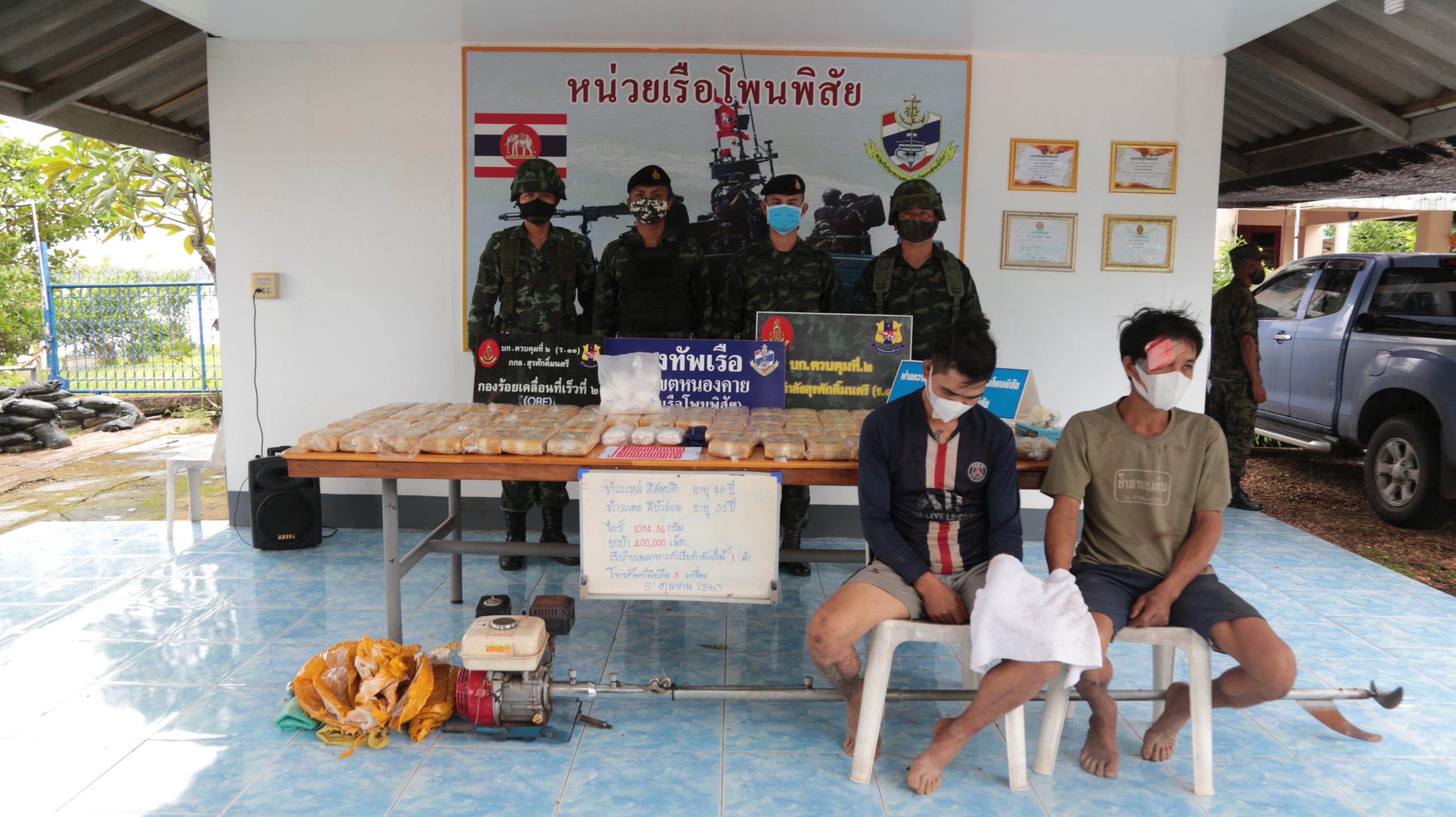 เมื่อ วันที่ 5 ต.ค. 63 ที่สถานีเรือโพนพิสัย อ.โพนพิสัย จ.หนองคาย น.อ.วรัท โกพลรัตน์ ผู้บังคับหน่วยเรือรักษาความสงบเรียบร้อยตามลำน้ำโขง .เขตหนองคาย, น.ต.การันต์ มินวงษ์ หัวหน้าหน่วยเรือโพนพิสัย, พ.ต.อ.ภูวิศ ศิริพานิช ผู้กำกับการสถานีตำรวจภูธรโพนพิสัย, นางชนาธิป เกาะสูงเนิน ปลัดอำเภอโพนพิสัย พร้อมเจ้าหน้าที่ นรข. ตำรวจ,ทหาร ได้ร่วมกันแถลงข่าวการจับกุม นายแหล่ สีสมบัติ อายุ 40 ปี และ นายแดง สีบัวอ่อน อายุ 32 ปี ชาวนครหลวงเวียงจันทน์ สปป.ลาว แบกกระสอบยาบ้า 4 แสนเม็ด และยาไอซ์อีก 1.05 กิโลกรัม จากเรือที่จอดริมตลิ่งขึ้น ภายใต้การอำนวยการของ พล.ร.ต.จรัสเกียรติ ไชยพันธุ์ ผบ.นรข.,พล.ต.บุญสิน พาดกลาง ผบ.กกล.สุรศักดิ์มนตรี,พ.อ.มงคล หอทอง ผบ.บก.ควบคุมที่ 2 กกล.สุรศักดิ์มนตรี ,น.อ.วรัท โกพลรัตน์ ผู้บังคับหน่วยเรือรักษาความสงบเรียบร้อยตามลำน้ำโขง .เขตหนองคาย,พ.อ.เรวัฒ ธรรมจิรเดช รอง ผบ.บก.ควบคุมที่ 2 กกล.สุรศักดิ์มนตรี